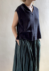 Glimmer Polo は袖の無いストレートシルエットのトップです。軽い編み地が風にそよぎ小さなアイレットを通して透けて見える様子はキラキラと光の粒がこぼれてくる様です。