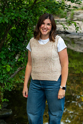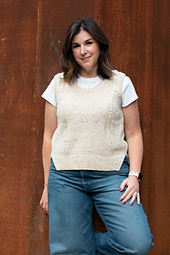Fieldstone is a crewneck vest worked from the top down. The back neck is cast on and shoulder shaping rows are worked flat followed by armhole shaping rows. Left and right front shoulders are picked up and worked flat with shaping for the neckline. Fronts are then joined and worked flat followed by armhole shaping rows. Fronts and back are then joined to work the body in the round. The vest features a stitch motif worked from top to bottom on the front, 1x1 rib down each side of the body, and a shaped front split hem. Split hem, armholes and neckline are finished with a 1x1 rib trim.