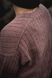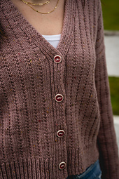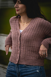 The Fidalgo Cardigan is a top down drop-shoulder cardigan with an all-over broken rib pattern throughout. The back neckband is worked first, and then the upper back is picked up from the worked collar sts. The back yoke is then worked to desired armhole length and put on hold, to then pick up shoulder sts and work both right and left front panels, while working the button band at the same time. Once desired armhole length is reached, all panels are joined and worked together flat.