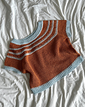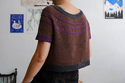 This is a seamless, top-down, round yoke tee. The cast on starts at the collar in 1x1 ribbing. After some short rows to shape the neck, a simple slip-stitch pattern, along with yarn over eyelet increases, are worked down the yoke. Raglan increases are then worked at the underarms, after which the body and sleeves are split to be worked separately. The bottom hem and arm bands are finished with an optional trim of slip-stitch pattern, and 1x1 ribbing.