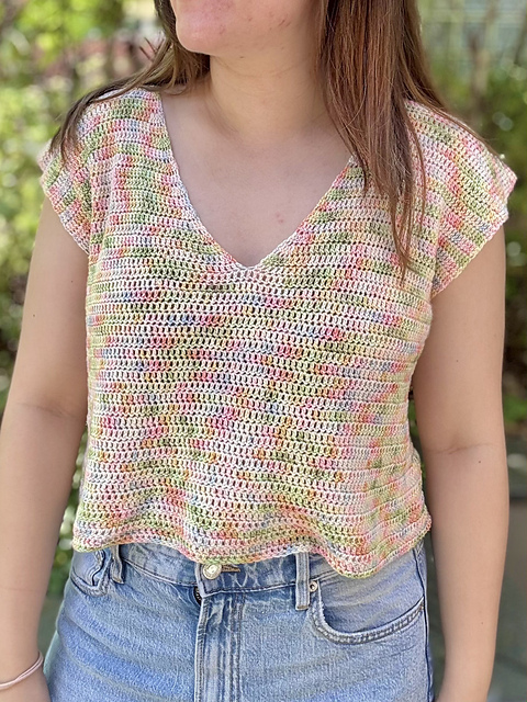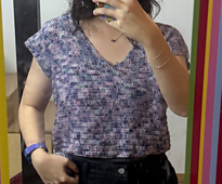 The construction starts from top down, worked in individual panels, before joining back to form the body. The neckline sits just above the cleavage, cleverly designed with a subtle scallop edge to give a soft look. The top finishes with a crab stitch edging to give a rugged unfinished look.