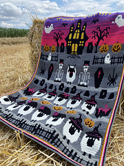 The blanket is made of 9 different parts using a variety of Halloween-themed motifs such as pumpkins, gravestones, witch hats, skeletons, spiders, coffins, and more.