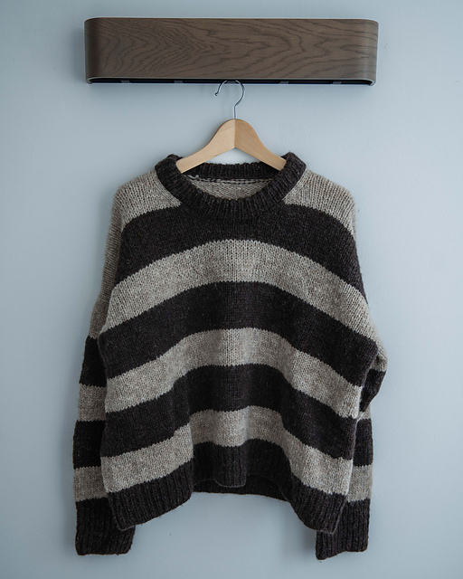 The SABLE SWEATER is a modified drop-shoulder design with bold stripes and a modern, oversized, boxy silhouette, knitted seamlessly from the top down.
