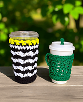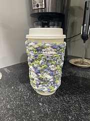 This pattern is for a crochet cozy or drink sleeve. I designed the pattern with Bernat Maker. It is a tubular yarn that is absorbent and works well for cozies.