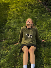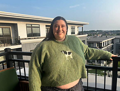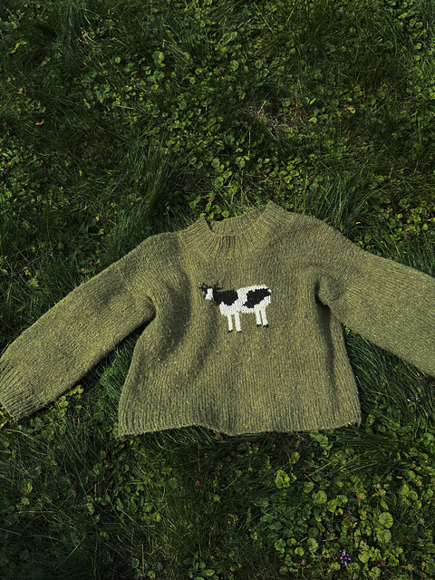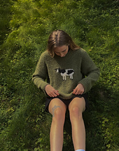 The Elizabeth Pullover is a cozy, oversized sweater, it is knit flat, first working the back panel and then picking up stitches along the shoulders to create a seamless look. German short rows are worked to shape the shoulders and the rest of the panel is worked, adding the cow motif in the middle of the front panel. After seaming the sides together, stitches are picked up for each sleeve and knit in the round.