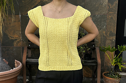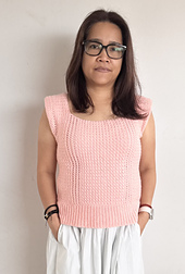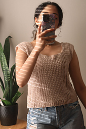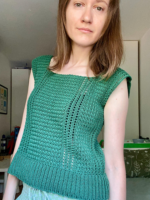 Scarborough Top is a sleeveless, close fitting top with a subtle drop-shoulder. It is crocheted side to side, and made out of two identical panels for front and back. The panels are then sewn together at the sides, leaving equal spaces for armholes. The pattern offers two options for the length of the top: cropped length or standard length. The bottom trim for both of the length options is added after sewing the panels together.