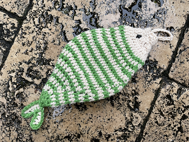 This striped fish-shaped dishcloth is a small size so easy to handle. It is knit starting at the mouth. To create the two color tail, a separate tail piece is crocheted and then attached to the body of the fish. The dish cloth has a hanging loop, to be easily hung to dry between uses. You can modify the stripes or make it in one color.