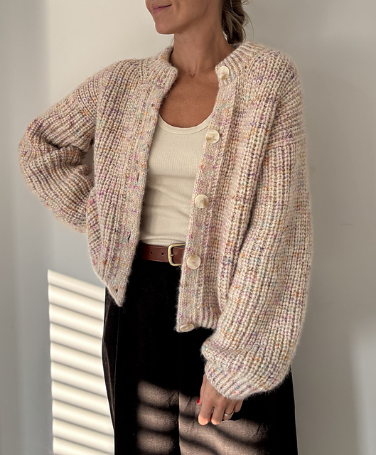 Chalcot Cardigan is a cosy oversized cardigan, worked from the top down in Reverse Half Fisherman’s rib stitch.