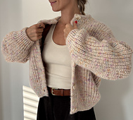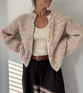 First the back is worked back and forth with increases either side. Stitches are then picked up along the back yoke to form each front whilst shaping the neck and subsequently the underarms. The front is then joined with the back and worked back and forth for the remainder of the body. Stitches are picked up around the armhole for the sleeves, which are worked in the round. All edges are worked in a half-twisted rib and bound off using the Italian Bind-off technique. A double-knit button band is worked on both side of the cardigan. Finally, stitches are picked up and knitted in twisted rib along the neck edge and then folded over and secured towards the wrong side.