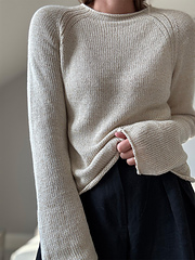 Everyday_loop_blouse is worked from top to bottom. The piece starts at the neckline, followed by German Short Rows which give extra height to the neck. The yoke is worked in the round with raglan ribbing and increases, which shape the shoulders. Then the work is divided into body and sleeves, which are worked in the round individually. The raglan ribbing continues down the body, where decreases and increases are worked to shift the ribbing towards the front piece, which give an elegant detail. Then the sleeves are worked at the end.