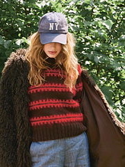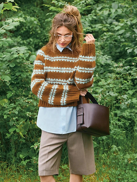 Ridge Sweater in Peer Gynt with pattern in Ballerina Chunky Mohair – a soft and cosy sweater with beautiful texture. Knitted from the top down, the fluffy mohair enhances the pattern for an extra striking effect. Perfect for playing with exciting colour combinations.