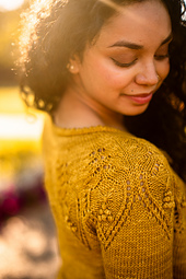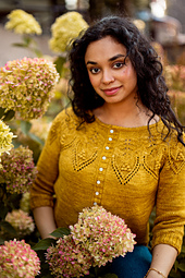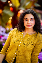 Flower Child Cardigan is knit seamlessly from the top down with a circular lace yoke. Once the yoke is complete, stitches are divided for the sleeves and the body is worked flat in stockinette. The hem is finished with 2x2 ribbing and a sewn bind-off. Sleeves are picked up and knit in the round, also ending in ribbing.