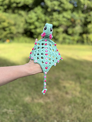 - Materials: size 4 yarn in 1-2 colors, E/3.5mm hook, 16mm sinker/trapezoid safety eyes (linked in the pattern), pony beads, blocking mat, pins, steamer/iron with steam, polyester filling, stitch marker, stuffing stick, optional small elastic hair tie (for head control)