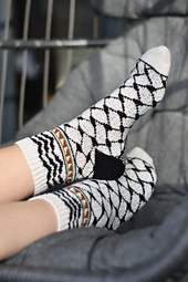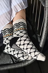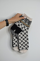 This toe-up sock pattern features intricate all-over colourwork inspired by traditional keffiyeh patterns - beautiful motifs that carry deep cultural significance. It’s written for four colours, but only two are ever used at a time.