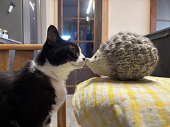 * **Fingering**で編む 13.5 cm のハリネズミ: メインの色26m, 模様の色38m