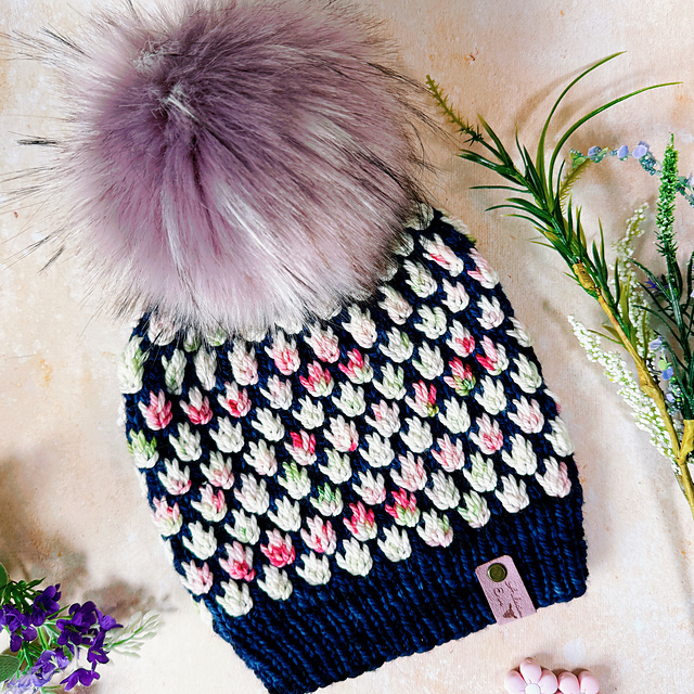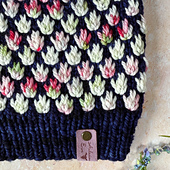 The pattern offers a choice of five different yarn weights. It is knitted in the round from the bottom up using the mosaic knitting technique; therefore, only one colour is used per round. The pattern repeat is a multiple of four stitches over six rounds. Size can be adjusted accordingly if desired.
