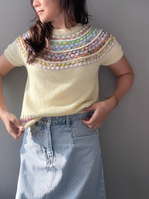 This seamless sweater is worked top-down, beginning with a ribbed neckline. The yoke is shaped with short rows and shoulder increases, then the body and sleeves are divided for working in the round separately to the hem and cuffs. The instructions include options for short sleeves and long sleeves. A photo tutorial guides you through the key steps of the bubble stitch pattern.