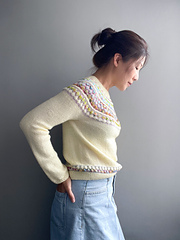 Whimsy Fancy is a sweater designed to bring a little joy to your everyday wardrobe. With its eye-catching yoke of bubbly textures and playful colour combinations, it balances sweet whimsy with timeless style. Inspired by vintage fabric with carefree use of colours, this top-down circular yoke sweater is a dream to knit, pairing your favourite main colour with mini skeins or a delightful mix of leftover yarns.