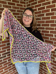 When Sarah from Dyeing Wishes Yarn Co invited me to design a shawl for A Woolen Affair 2025, I couldn’t say no! I always love working with Sarah and her beautiful colorways. The shawlette sample was made with her AWA 2025 exclusive sock set, Party at the Brickyards!