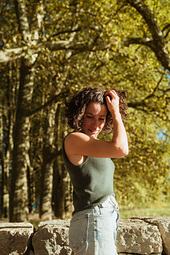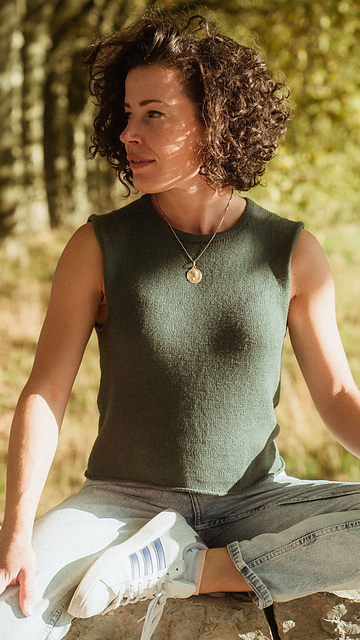 Curly hair model: 165 cm / 5’5” tall, chest and full bust 85 cm / 33½’’. Wearing a modified size 2 without bust darts in fingering weight.