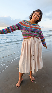 The Mosaic Jumper Light is a celebration of nature at its best! It’s inspired by flower meadows that lay dormant in winter only to burst out in color with the arrival of Spring. With ALL of the colors and fun mosaic graphics, it’s the perfect garment to use up yarn in your stash and to experiment and have lots of fun with color. It’s a round yoke pullover with short rows at the back for a perfectly comfortable fit. It can be cropped or full length and has loose sleeves that puff slightly at the bottom.