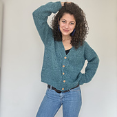 The Soft Season Cardigan Pattern is available in 9 sizes, from XS up to 5X Large. The model is 168 cm tall, with a 88 cm bust circumference, and wears a size Small.