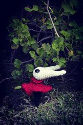 Her features include a crescent head with ears that looks a bit like a bunny. She has a classic red dress. She carries a needle sword which I've just used my trusty yarn needle as a prop.