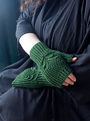 Companions to the [Greenery Hat][2] and [Greenery Cowl][3], these richly textured mitts feature elegant leaves, crisp half-twisted ribbing, and contrasting seed stitch. The leafy motif combines a cluster stitch, two-stitch cables, and simple lace, but in any round you will only need to use one of these techniques. The gusset increases are placed on the palm side only, to create a graceful shape and comfortable fit.