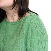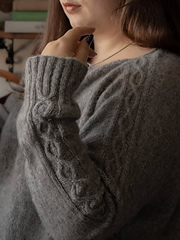 NEPHELE is worked seamlessly from the top down holding two strands of yarn throughout the entire project. First you cast on the neckline and work the cable detail on the saddle shoulder. Then stitches for the front and back are picked up and both panels are worked flat and separately before joining in the round at the underarm. The body is finished off with a refined split hem and 2x2 ribbing. Finally stitches are picked up for the sleeves which are then worked top down in the round.