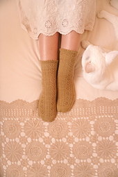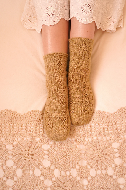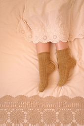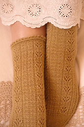 These socks are worked toe-up with a wedge toe, a gusset, a slipped stitch heel and a decorative bind off. A textured pattern with lace flowers is worked on the top of the foot and around the leg. The pattern offers the option to work a regular or a high instep. The sample is shown in size 4 with a high instep.
