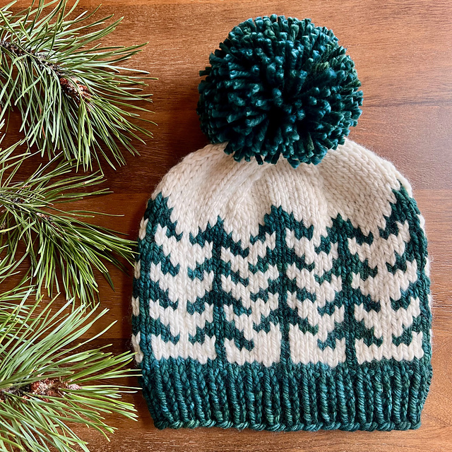 The Evergreen Hat is written for Bulky weight yarn and is sized for an adult. The stranded colorwork is a simple repeating pattern that knits up quick and is great for seasoned knitters and those new to colorwork knitting.