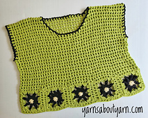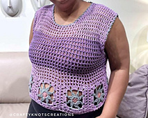 The **Klassic Granny Tee** is a **loose fitting**, **no sew**, **easy** to crochet **mesh tee** that is **cool** and **comfortable** to wear. I designed a **unique granny square** motif to add interest along the hemline and convey a special story, or yarn, for me. (The inspiration and name for this tee, which you might enjoy reading about, is explained in the pattern.) A simple finishing stitch is used around the neck and armholes for the perfect edging. This tee is easy to customize for your perfect fit.