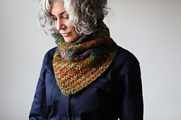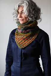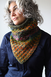 This cowl was designed using a fun and engaging 2 color slipped stitch pattern. The bandana shape makes a stylish unisex design that’s easy to pair with any outfit and the bulky yarn will keep you extra warm on those cold days. There are two fabric types and sizes to choose from. A looser gauge that has more drape and a tighter gauge that’s great for keeping that cold air out.