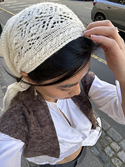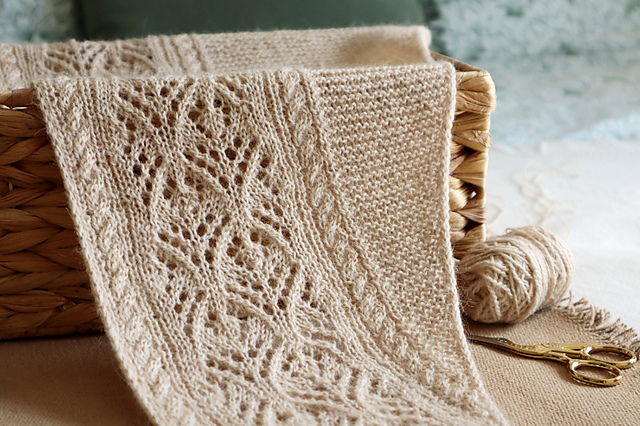 The lace pattern and cables run along the longest side of the scarf. Increases are made on the right side of the tip of the scarf until the desired width before decreasing back to the other tip of the scarf.