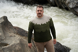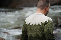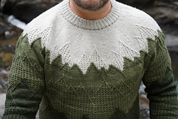 The Call of the Wild is a unisex, size-inclusive, round-yoked colorwork sweater knit seamlessly from the top down, beginning at the collar. The circular yoke is adorned with twisted stitches that create the silhouette of the distant mountain ridgelines with alternating sections of Stockinette and Half-Twisted Broken Rib, which continue throughout the body and the sleeves. You will separate the sleeves, placing them on hold, while the body is finished all the way to the hem. The sleeves are then returned to the needles, picking up stitches for the underarm, and worked to the cuff.