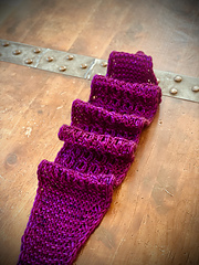 The construction is simple yet satisfying: you’ll begin with a cast-on and a short garter stitch increase section to build your desired width. From there, the scarf flows into the main body, worked in a lace stitch that mimics the look of cables—without ever touching a cable needle. Once you’ve reached your ideal length, you’ll taper back down with neat garter stitch decreases, finishing with a sharp, polished tip. A built-in faux I-cord edge frames the whole piece, giving it a refined finish without any extra work. Stitch count: a multiple of 3 + 10.
