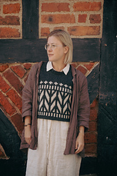 The Korsvirke slipover is inspired by the beautiful old half-timbered buildings of Jutland, where I often travel in summer. The graphic pattern and high-contrast colours make this a striking garment and a fun and rather quick project.