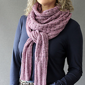 This beautiful wrap features a wonderful eyelet-basketweave pattern which alternates with a matching wide ribbing that grows seamlessly in and out of the tips of the shawl.