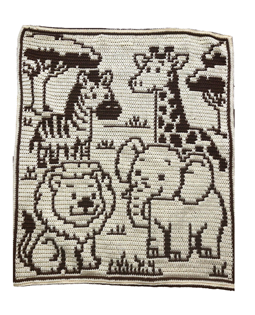 This pattern is written for 2 colors of yarn, any tapestry crochet (color changes) would be done manually and are not included in the pattern. This blanket can be made in any weight yarn, but I recommend worsted weight (4) to ensure the size. The pattern is 109 stitches across by 129 rows tall. If made with worsted weight yarn, the finished blanket should measure about 31” wide x 37” tall, not counting the fringe or border.