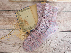 The Ex Libris Socks are a tribute to that tradition of personal libraries and the little works of art that label them. The design begins with a snug 1x1 twisted rib cuff. The leg features a lace panel inspired by the graceful botanical illustrations and delicate borders of classic bookplates. A classic eye of partridge heel adds a layer of texture, comfort, and durability, and a soft rounded toe. Worked from the top down, these socks offer a rhythmic, relaxing knit with a touch of poetry. The pattern includes three sizes, and as always, you’re welcome to substitute your favourite heel or toe techniques for a perfect personal fit.