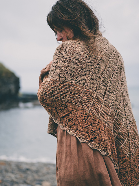 Named after a now uninhabited island off the coast of Sligo that I can see on clear days when walking on the beach, INISHMURRAY is a symmetrical triangular shawl knitted top down. I wanted to treat myself to a fairly traditional looking shawl that is quite simple yet fun and engaging to knit. I find that a traditional triangular shawl is probably the most versatile shape for everyday wear, whether it is used as a cozy wrap on chilly spring or autumn morning, lap blanket in front of the fire or a scarf on cold and windy winter walks.
