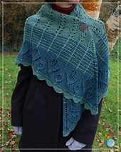 The shawl is started with a garter tab cast on and then it proceeds with even increases along the center spine and the sides to create its shape. It features sections of very simple lace and garter stitch stripes and is finished with a garter stitch scalloped border.