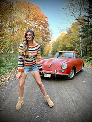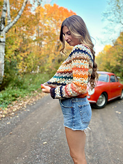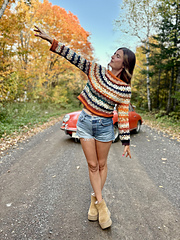 The straight body and relaxed rolled hems keep the silhouette casual and layer-friendly, while the sleeves taper gently toward ribbed cuffs for a polished finish. It’s a sweater designed for joyful knitting and everyday adventure — equally at home by the campfire or out in town.