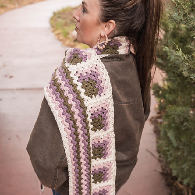 The Winnie Scarf is just the thing to keep you warm and cozy on a chilly day. This beautiful statement scarf can be made quickly and easily using mitered granny squares and rows of granny stripes.