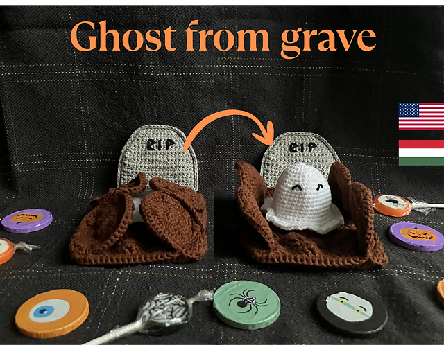 Regular weight yarn: The grave is 12 cm / 4.7’’ long and 10 cm / 3.9’’ wide, the tombstone is 7 cm / 2.8’’ high.