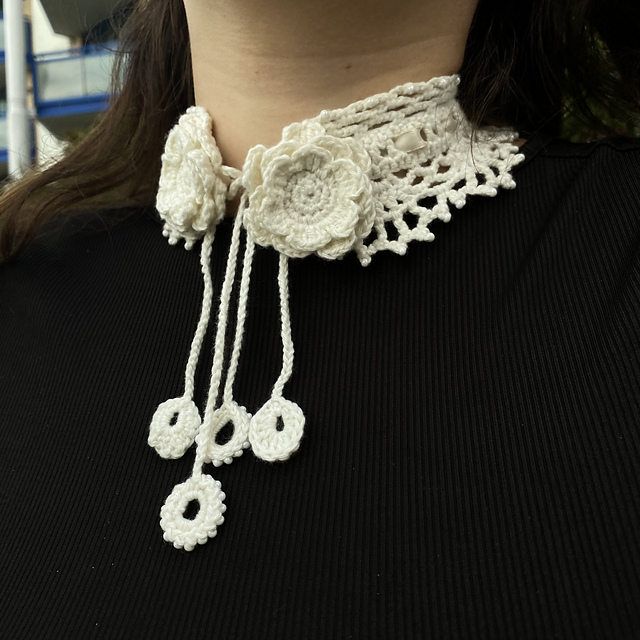 This pattern creates a delicate crochet necklace featuring fine details.