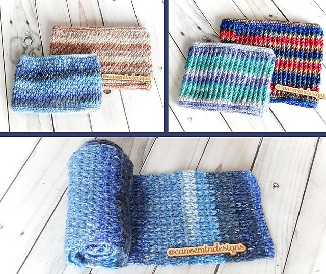 Quick and easy patterns with lots of texture. Three different stitch patterns that are fun to crochet. Use any worsted weight yarn, solid colors, stripes or self striping yarn. A great stash busting pattern, change colors as often as you like.