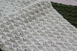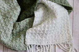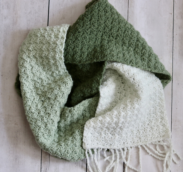 Yarn: Caron Cloud Cakes Perfect Phasing ® by Yarnspirations ® (100% Polyester; 227 g/8 oz; Approx. 720 yds/658 meters). Medium (4). Colour Shown: Fir. You will need 1.5 cakes to complete the scarf.