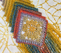 The Fall Festival Scarf is a lightweight buttoned scarf featuring gorgeous floral focal square, sophisticated ribbing, and flirty boho fringe! It's the ideal project for fall markets, festival wear and winter gifting!