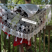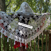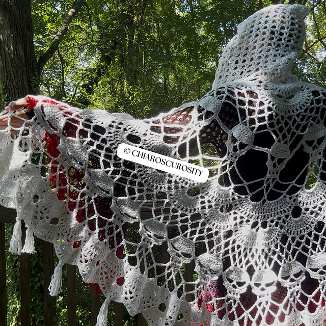 This shawl is worked flat in rows from the top down. The skulls are constructed and connected to each other, separately, after which they are connected to the main body of the shawl.